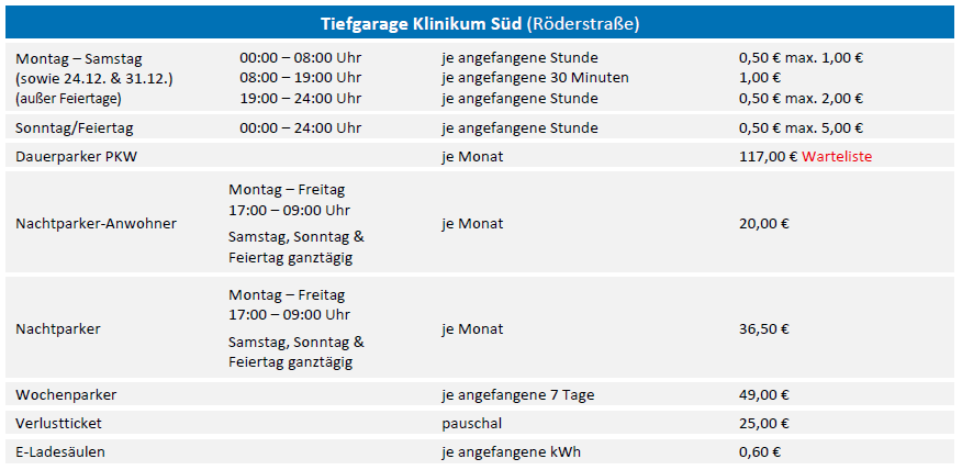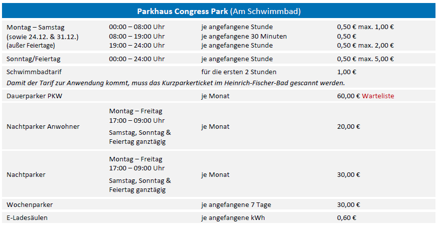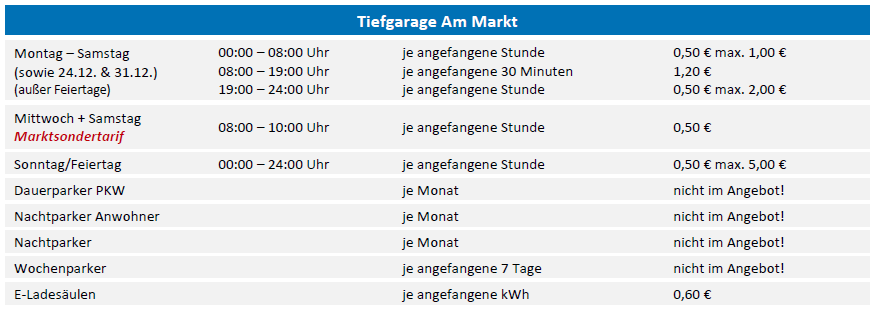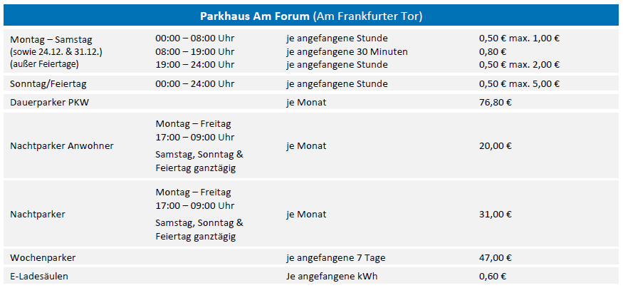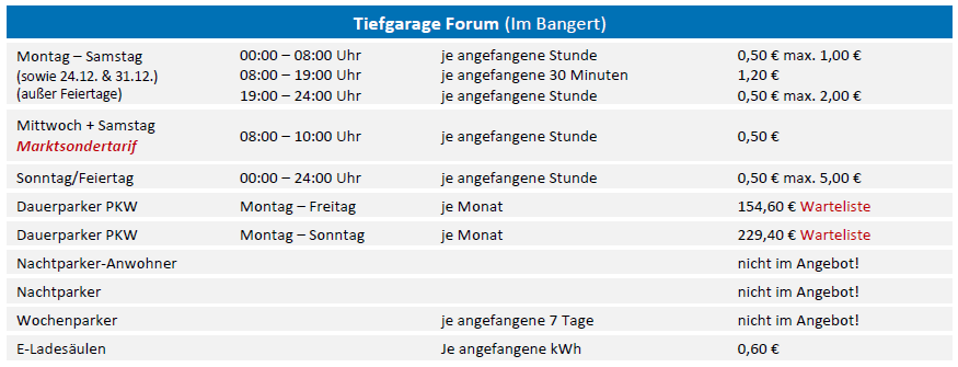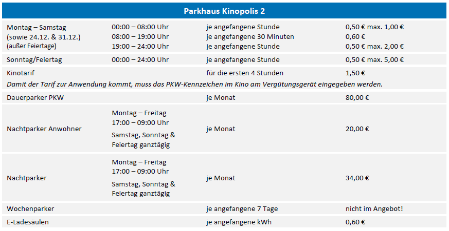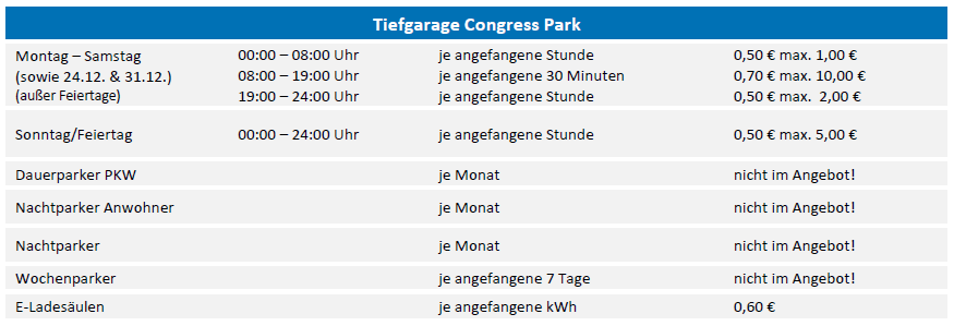 - Sondertarife wie z. B. Dauerparker- oder Nachttarif sind nur mit einem vorab abgeschlossenem Vertrag möglich. Der Wochentarif muss ggf. beim Bezahlvorgang an der Kasse ausgewählt werden.