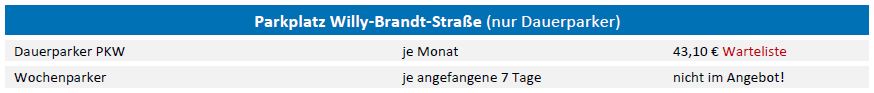 Bitte beachten Sie – maßgeblich für die Abrechnung, sind die vor Ort an der Einfahrt ausgehängten Entgelte. Mit Befahren der Parkanlage werden die dort ausgehängten Einstellbedingungen akzeptiert und sind somit Vertragsbestandteil.