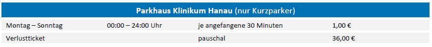 - Alle Preise für die Leistungen der Hanauer Parkhaus GmbH enthalten, soweit nicht anders vermerkt, die aktuelle gesetzliche Umsatzsteuer.
