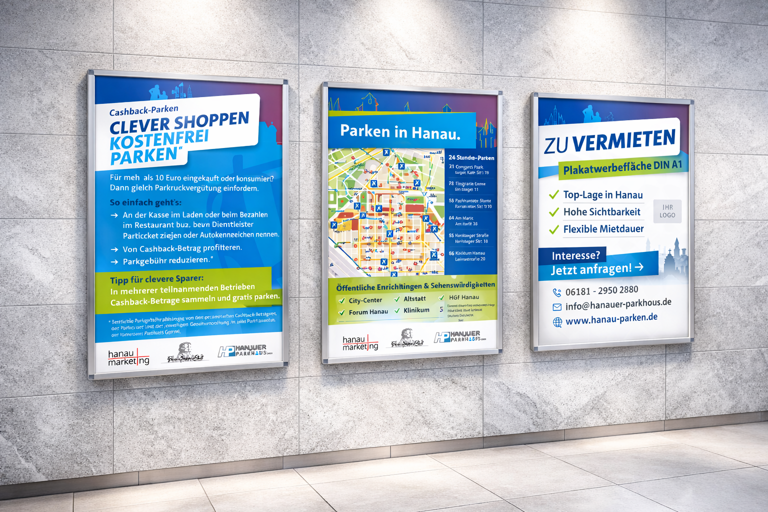 Unsere Parkhäuser liegen an unterschiedlichen zentralen Punkten in Hanau. Alle dieser Parkhäuser weisen eine hohe Kundenfrequenz auf und liegen an verkehrsgünstigen Punkten, mit viel Durchgangsverkehr.